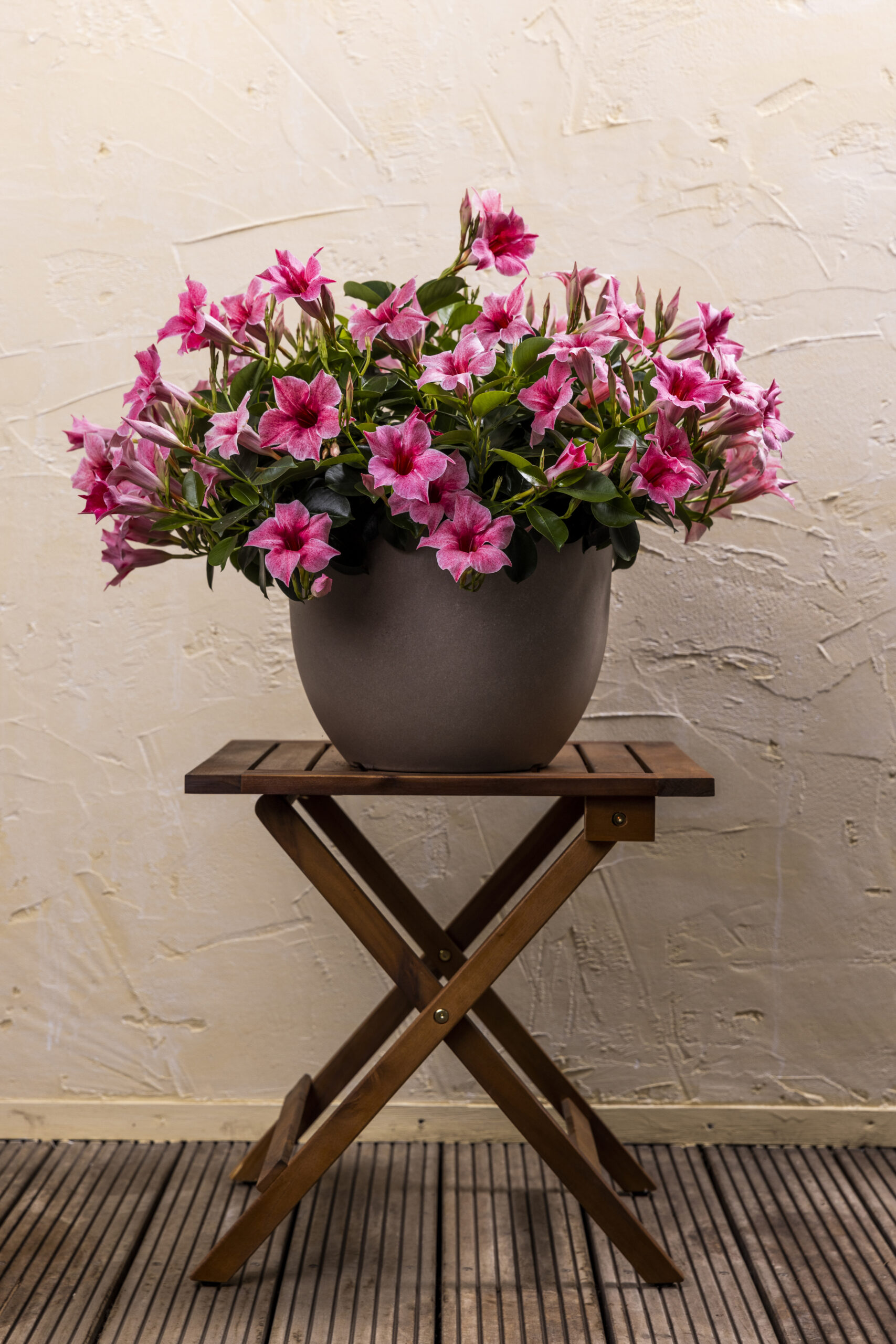 Caring for the Mandevilla Flamingo Pink Mini is simple and suitable for both beginners and experienced gardeners. Use light, well-draining potting soil to prevent excess water. It is important to avoid overly wet roots.