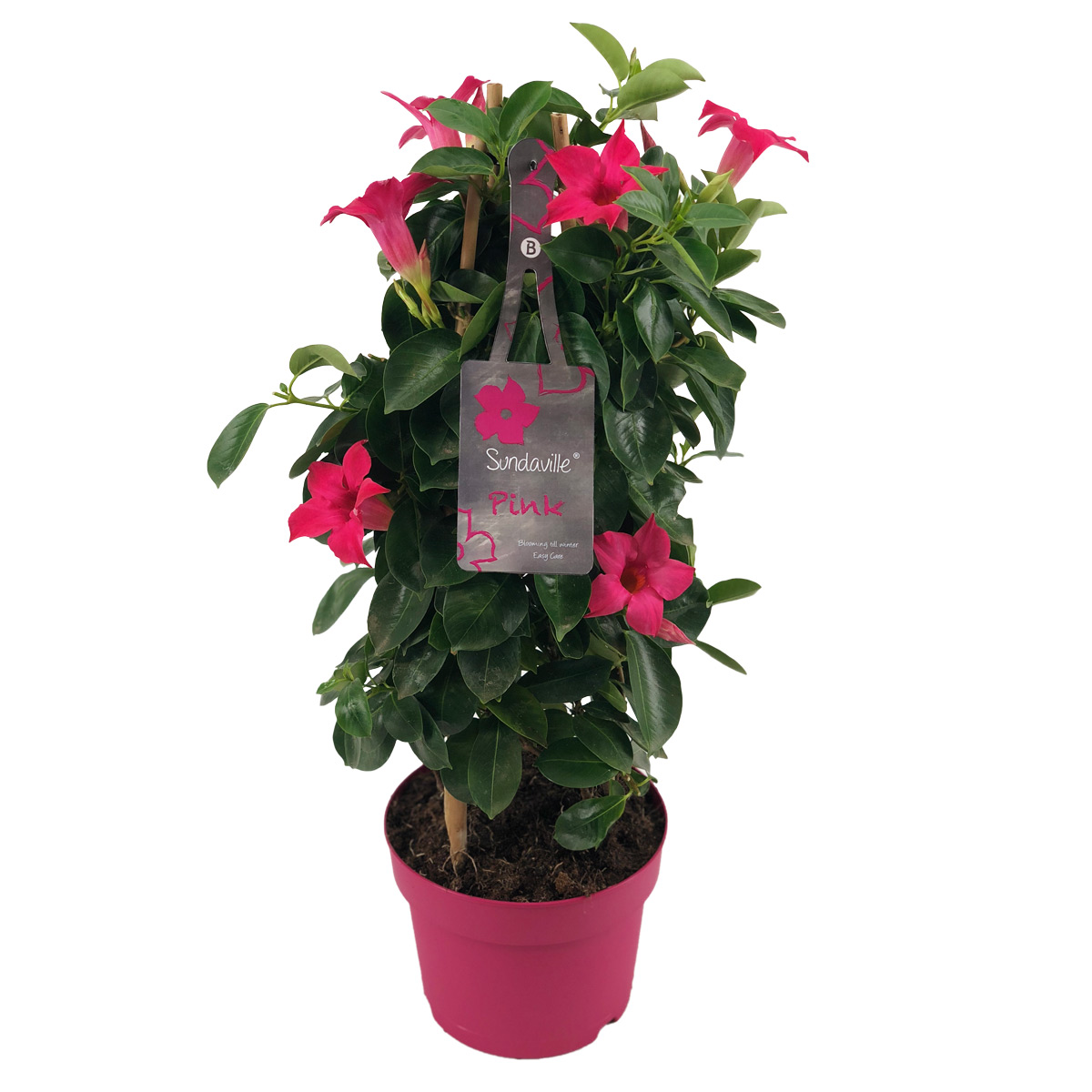 Deze Mandevilla Sundaville valt direct op door haar royale formaat en helder roze trompetvormige bloemen,